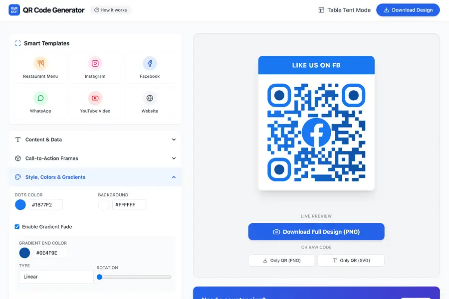 Create beautiful QR codes with themed designs for menus, promotions, reviews, or contact info. Download instantly and use them online or in print without technical setup.